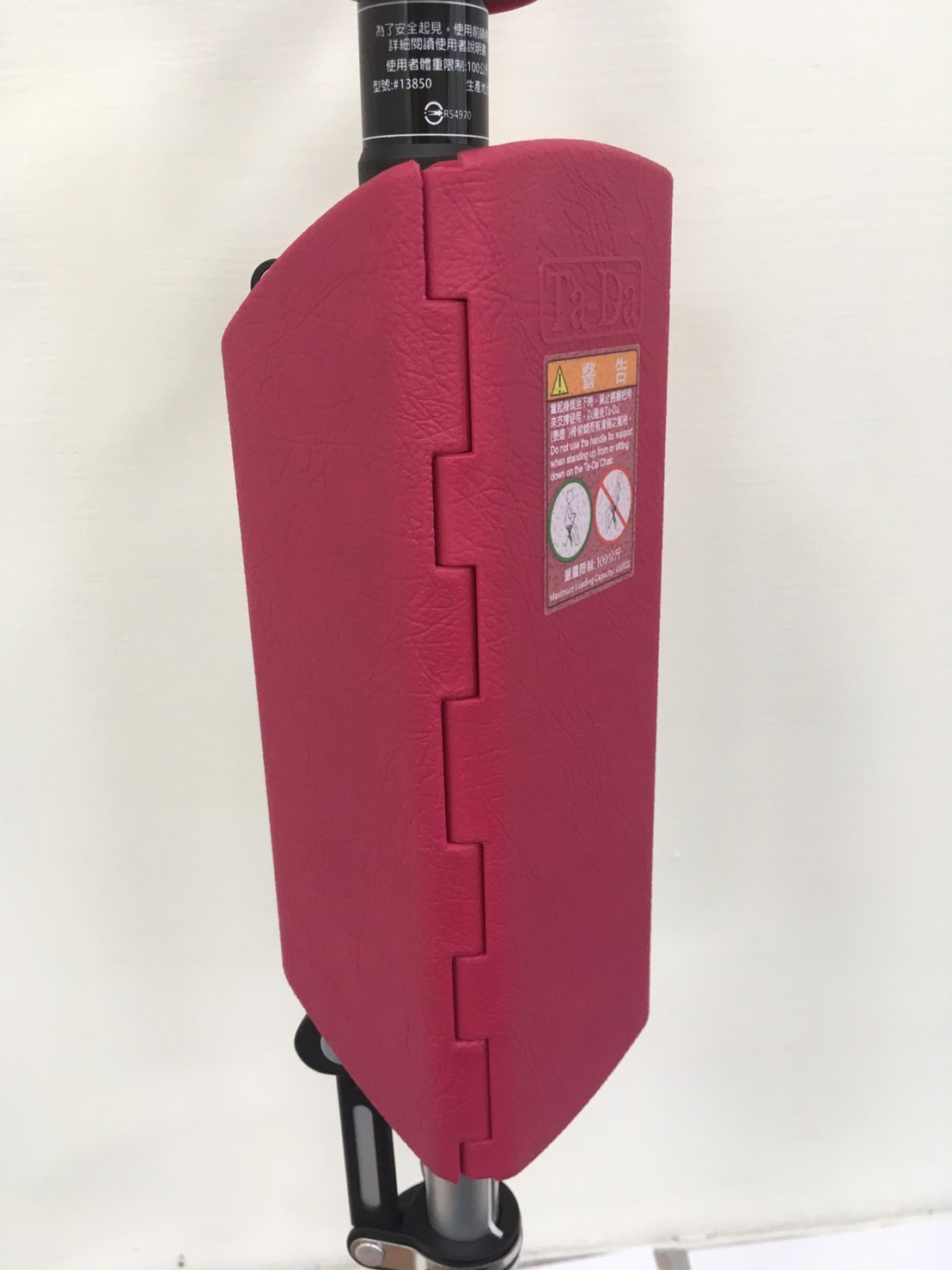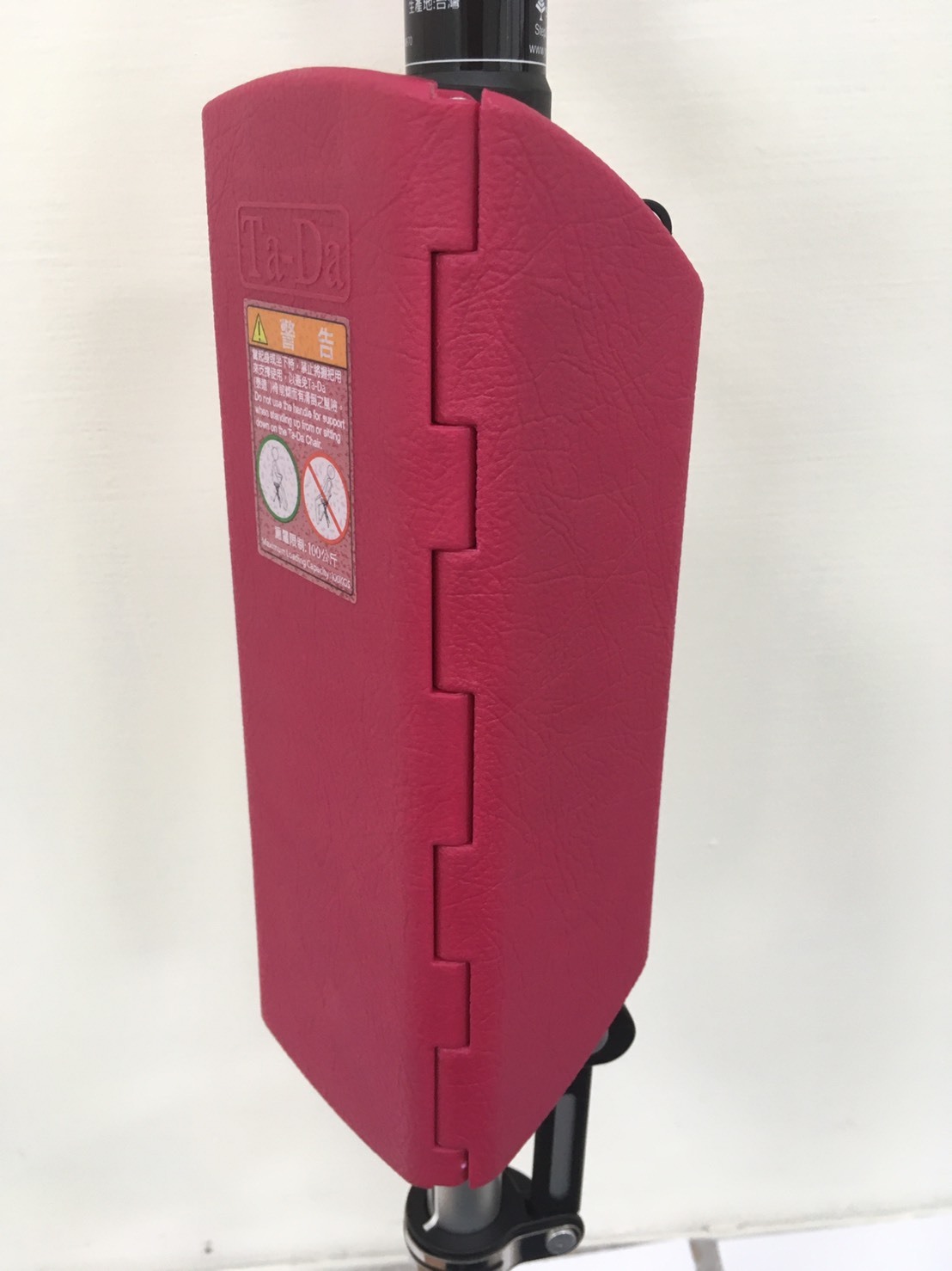 ส่วนถัดไป เรามาดูส่วนที่นั่งของไม้เท้าเก้าอี้ Tada Chair กันบ้าง ส่วนที่นั่งประกอบจากแผ่นพลาสติกที่ทำจาก พีพีไนลอน 3 แผ่นประกบเข้าด้วยกัน เวลาใข้งานเป็นไม้เท้า แผ่น 3 แผ่นนี้ก็จะประกบคลุมไม้เท้า ดังที่เห็นในรูป และยังสามารถสังเกตแผ่นสติ๊กเกอร์ แนะนำการนั่งที่ถูกวิธี เวลาใช้งานไม้เท้าเป็นเก้าอี้ พร้อมทั้งคำเตือนว่า ที่บอกว่าไม้เท้าเก้าอี้สามารถรองรับน้ำหนักได้สูงสุด 100 kg ทั้งนี้เพราะเกรงว่าถ้าผู้ใช้งานนั่งผิดวิธี นั่งหันหลัง เอนไปกับไม้เท้า จะเกิดอันตรายทำให้ผู้ใช้งานพลัดตกได้ การนั่งหลังตามที่เห็นในรูป คือการนั่งที่ปลอดภัยและทำให้ทรงตัวได้อย่างสมดุล